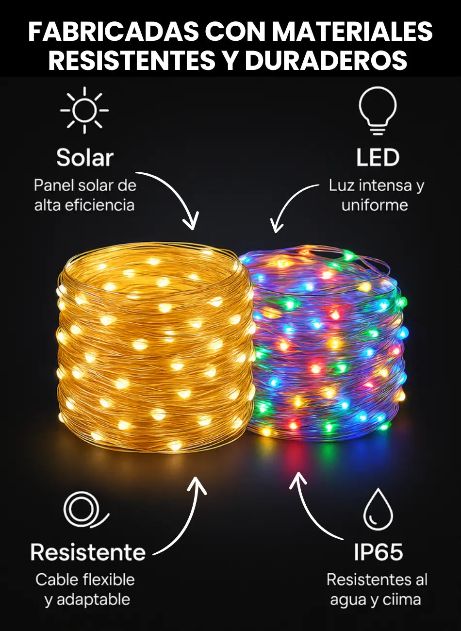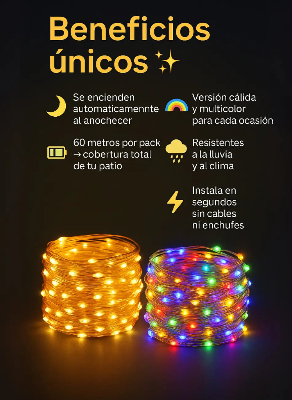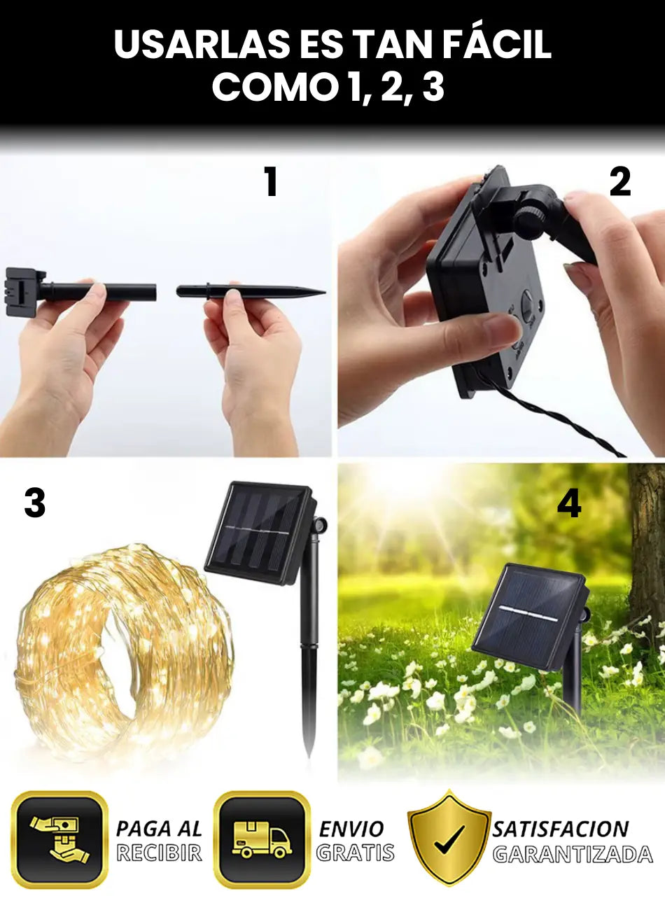Sí, solo clava el panel solar o enreda las luces en barandas/árboles ¡y listo!