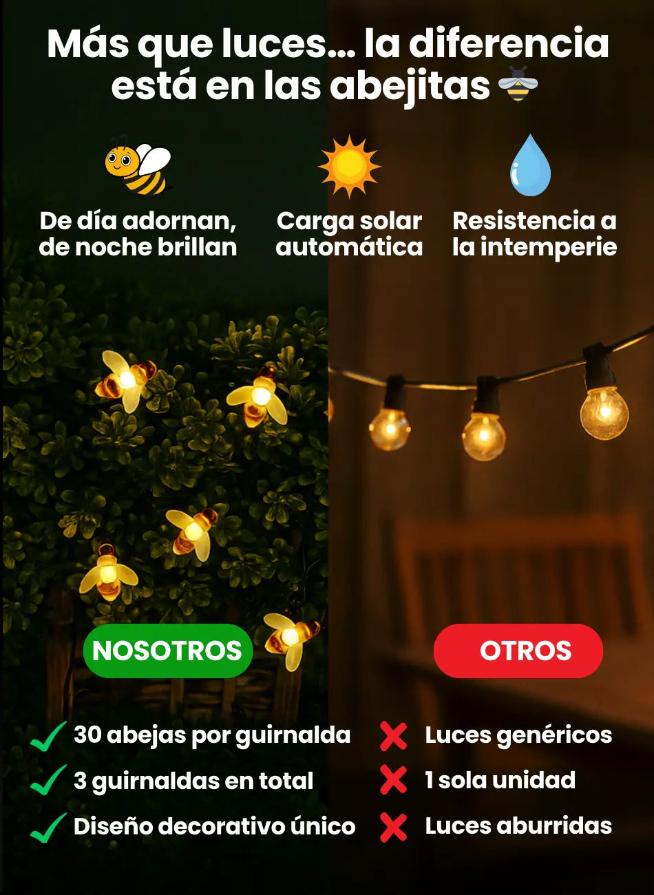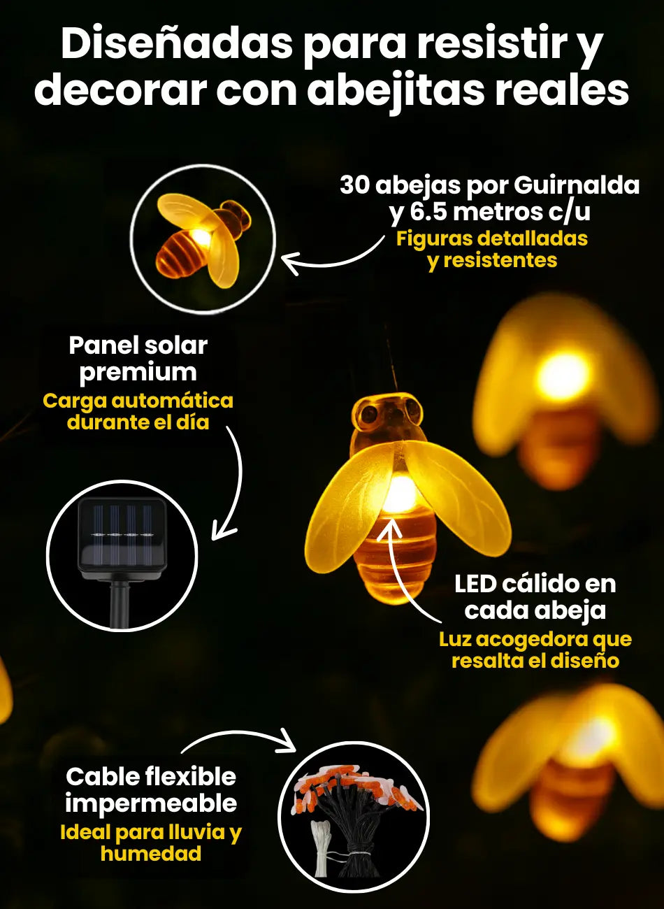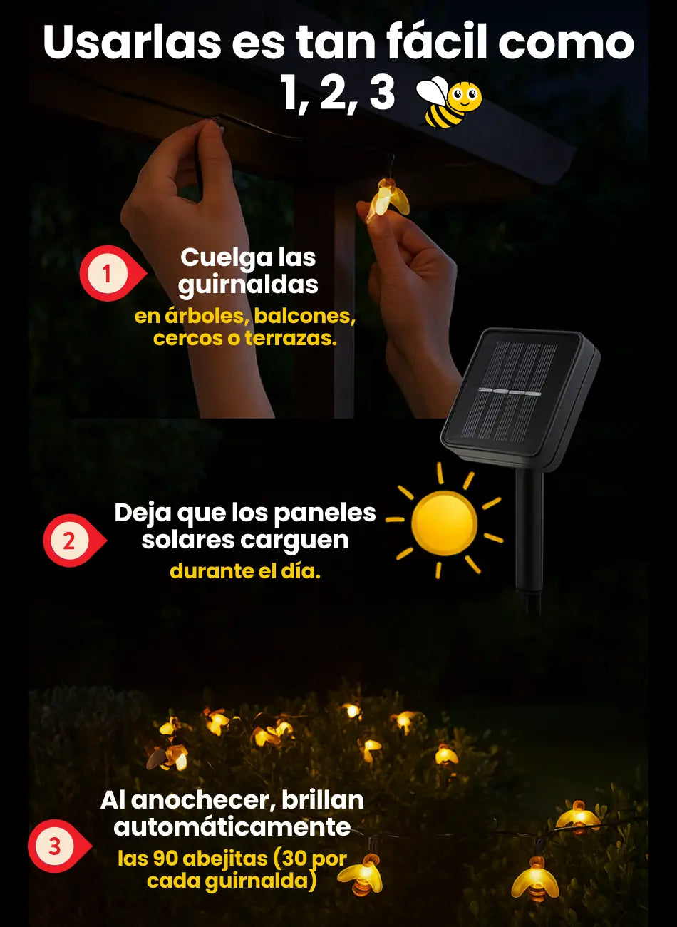 Cada guirnalda tienes 30 abejitas LED que se cargan al sol y brillan automáticamente en la noche.