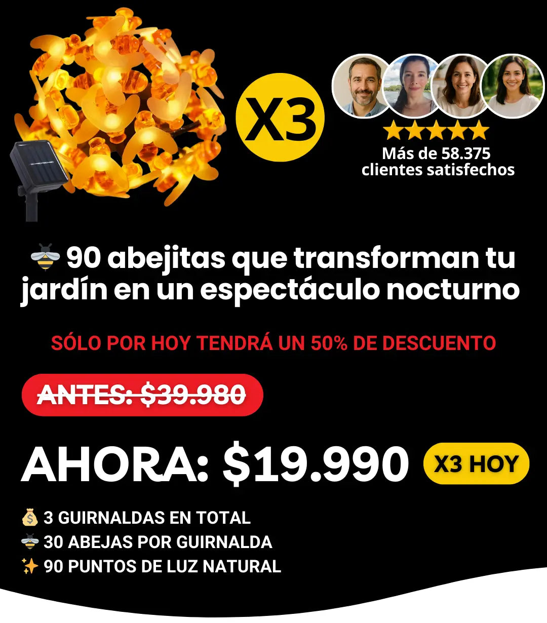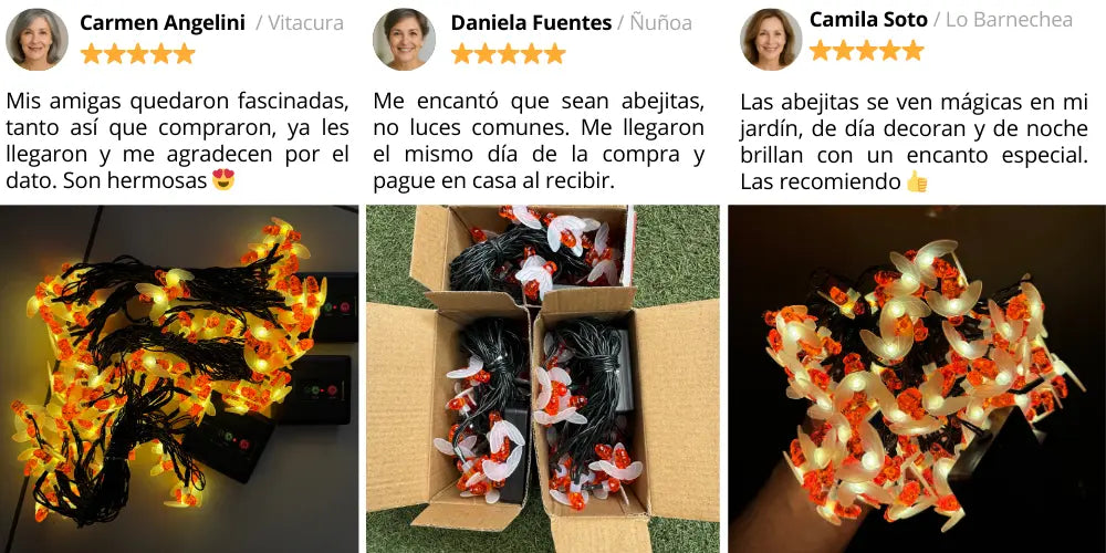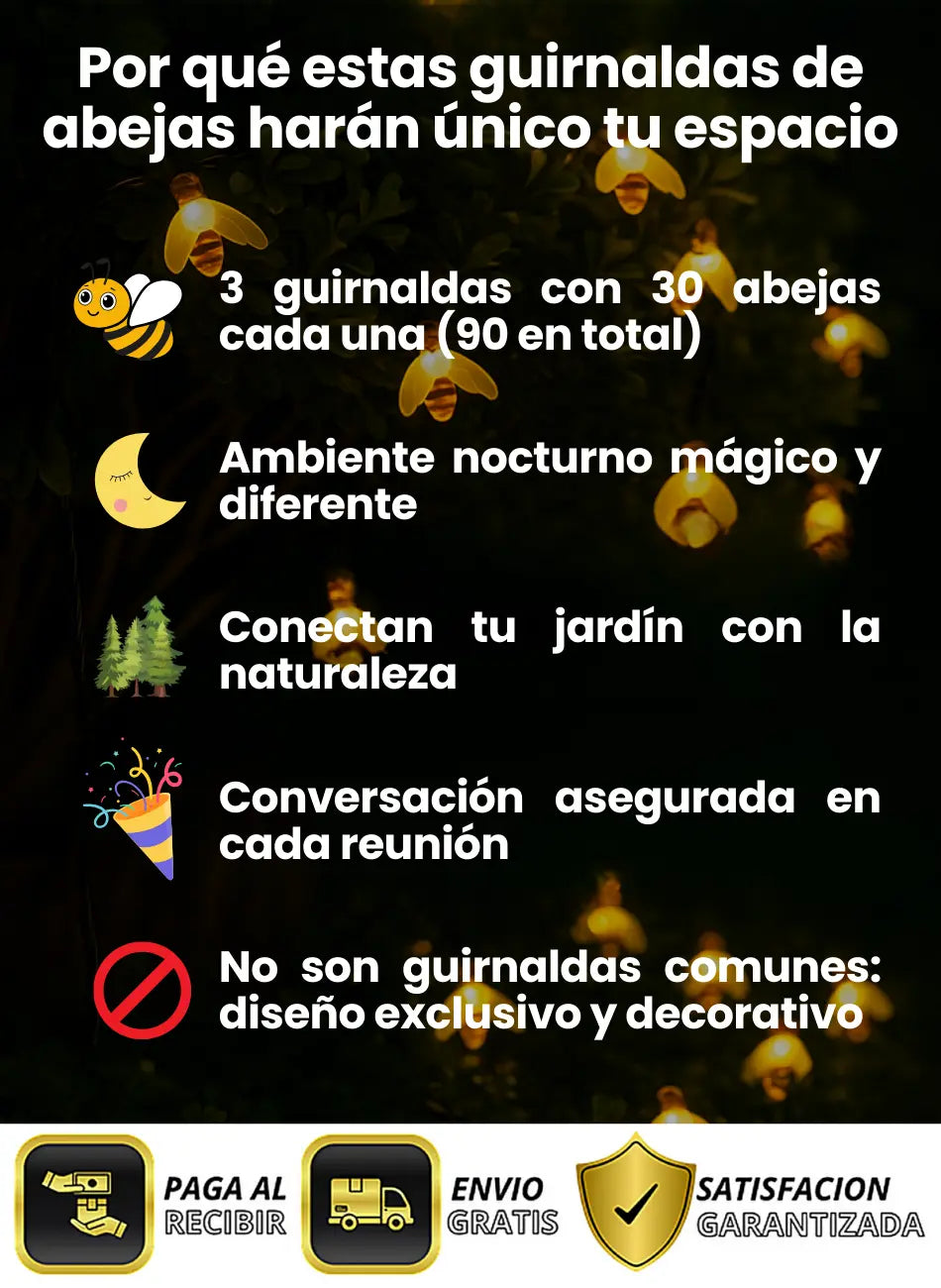 Cada guirnalda tienes 30 abejitas LED que se cargan al sol y brillan automáticamente en la noche.